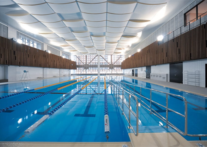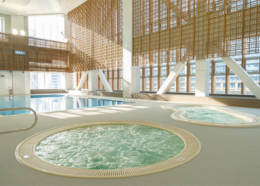 25m×8 コースの大プールと水位を変更できる可動床の小プールのほか、ジャグジーや採暖室を備えた開放的なプールです。