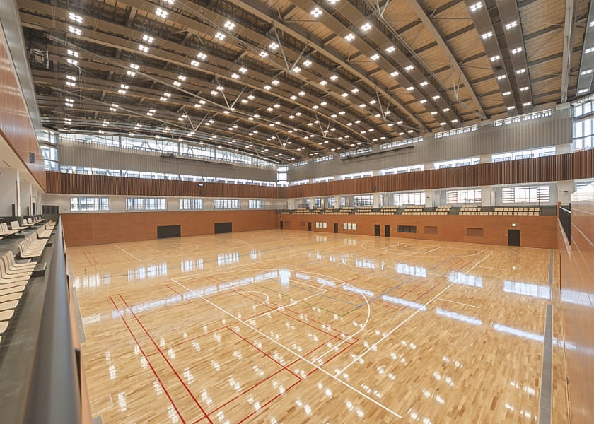 光に包まれた広々としたアリーナは、様々な競技スポーツで利用できます。